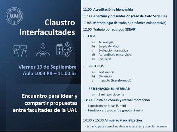Se informa que el día 19 de Septiembre se llevará a cabo el Primer Claustro Inter facultades en la Sede Rosario, el encuentro estará coordinado por los Decanos de las Facultades y se propone generar ideas y compartir propuestas entre docentes de las facultades, en este encuentro se definieron ejes de trabaja y criterios de evaluación.