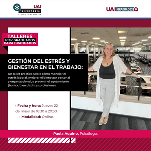 Este taller, a cargo de Paola Aquino, graduada UAI en Psicología, te ayudará a prevenir el agotamiento laboral desarrollando estrategias para aplicar en tu vida diaria, fomentando tu desarrollo personal y profesional.